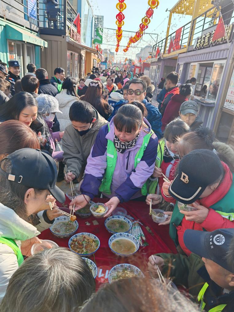 梯田夜肆商業街區的店鋪早早貼上了“?!弊趾图艏埓盎ā,F場舞腰鼓、吼秦腔、展歌舞、迎春倌、送春聯,還有“媽媽的油香”和彭陽縣非遺農特產品等前來助力。屋內飄出的縷縷香味,讓當地群眾和游客絡繹不絕前來品嘗“彭陽十大碗”?,F場還特邀了環衛工人、護林員、園林工人、出租車司機等48人歡樂過大年。
