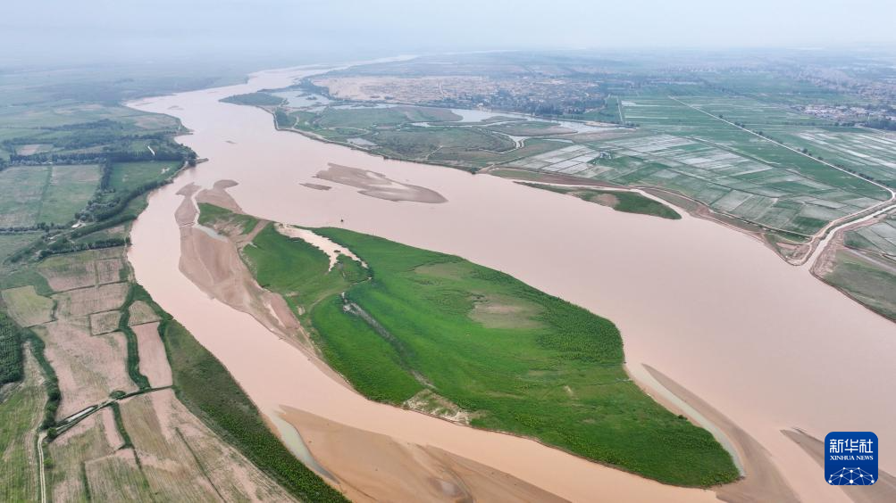 在寧夏賀蘭縣境內拍攝的黃河灘涂濕地(無人機照片,6月22日攝)。