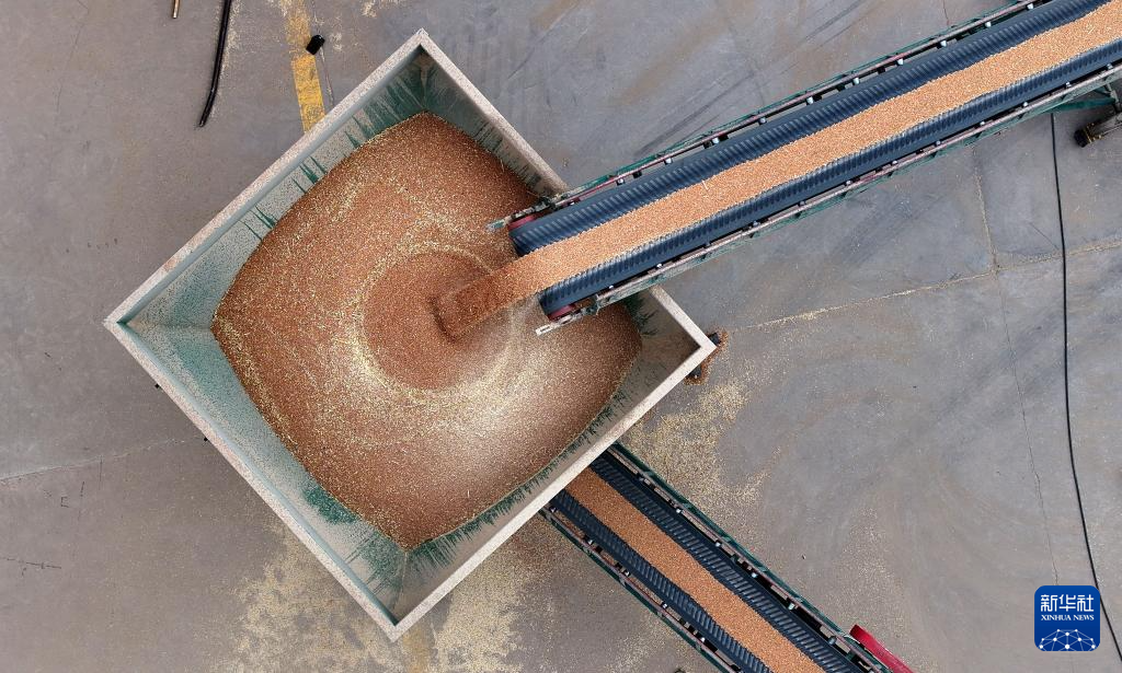 7月16日,寧夏糧食集團銀川濱河儲備庫,自動化輸送設備將小麥輸送入庫(無人機照片)。