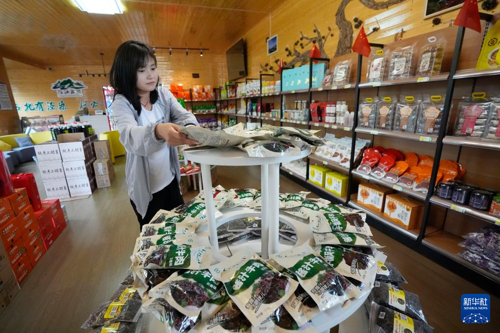 7月19日,工作人員在寧夏固原市涇源縣涇河源鎮冶家村民宿旅游區特產店整理商品。