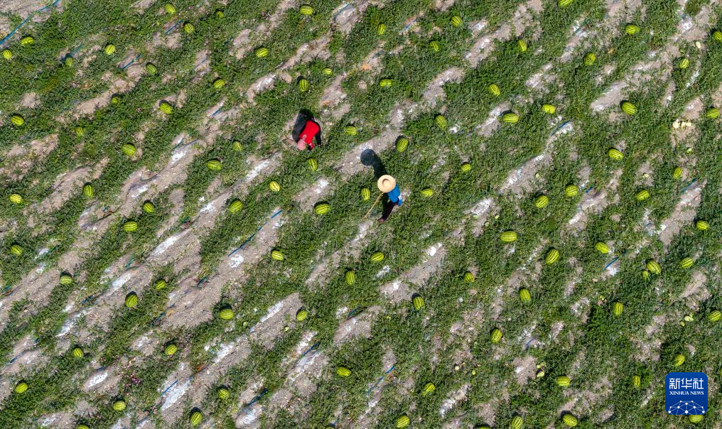 7月20日,農戶在中衛市沙坡頭區香山鄉硒砂瓜田里勞作(無人機照片)。