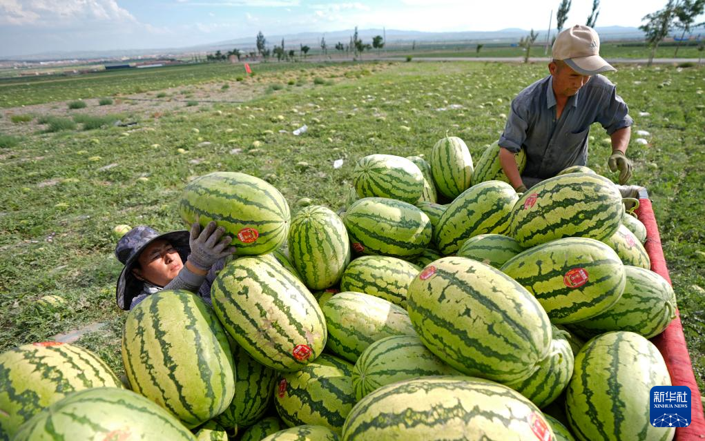 7月20日,農戶在中衛市沙坡頭區興仁鎮采摘、轉運硒砂瓜。