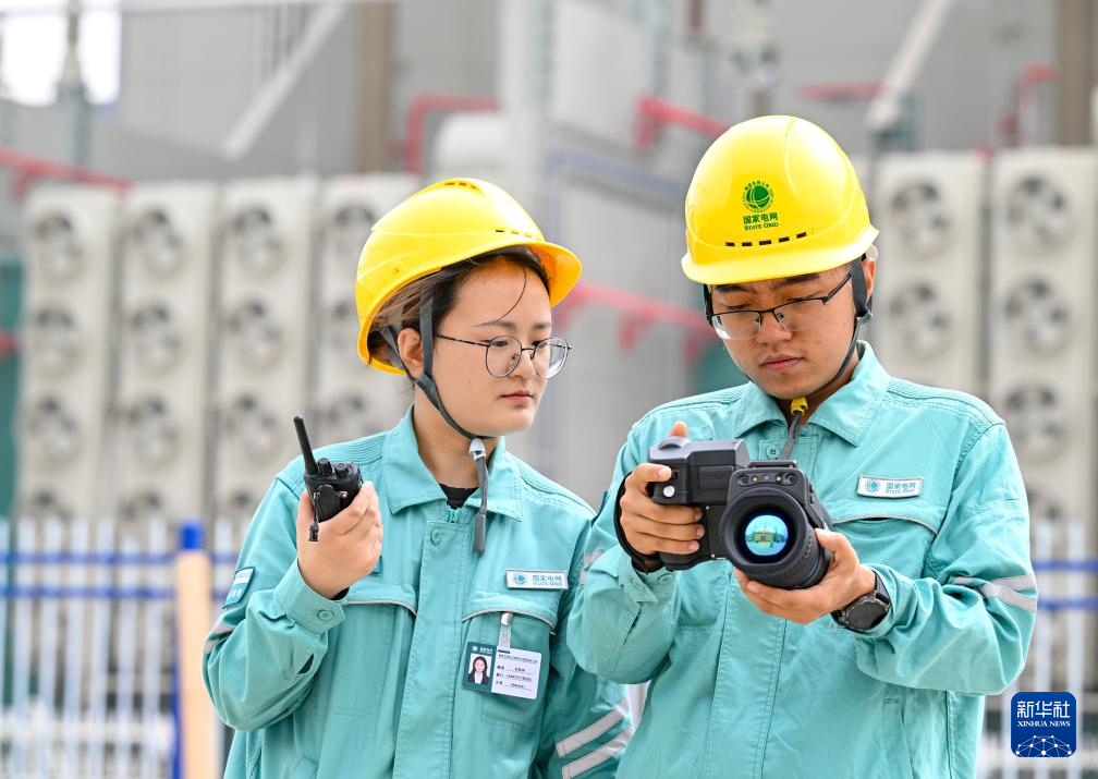 8月20日,在“寧電入湘”工程寧夏中衛市中寧換流站內,檢修人員通過測溫儀對已投運的線路進行紅外測溫。