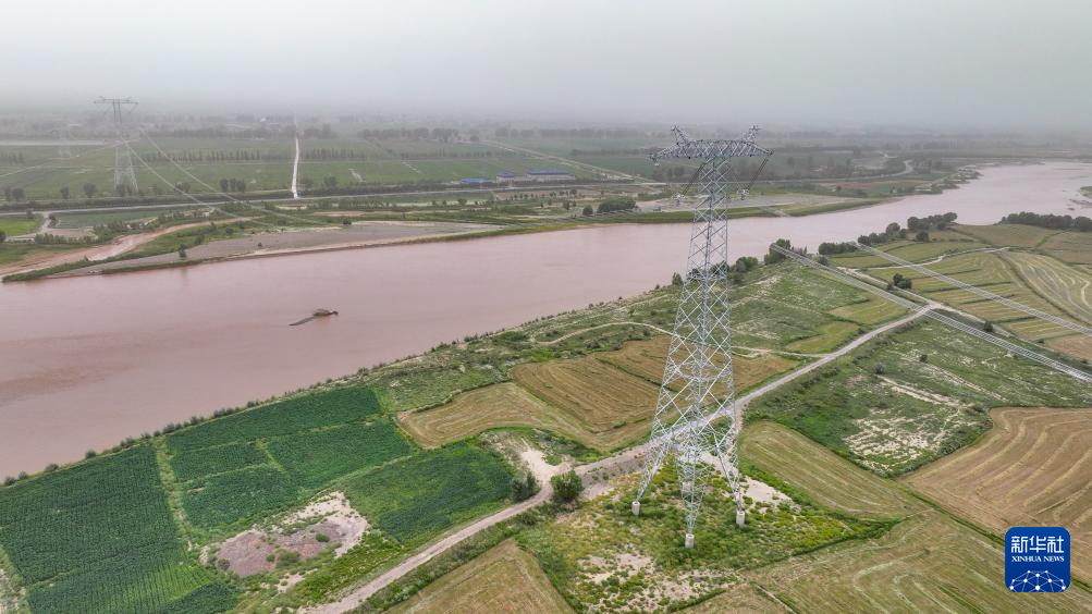 這是8月20日拍攝的“寧電入湘”工程寧夏中衛市境內跨黃河段直流輸電線路(無人機照片)。