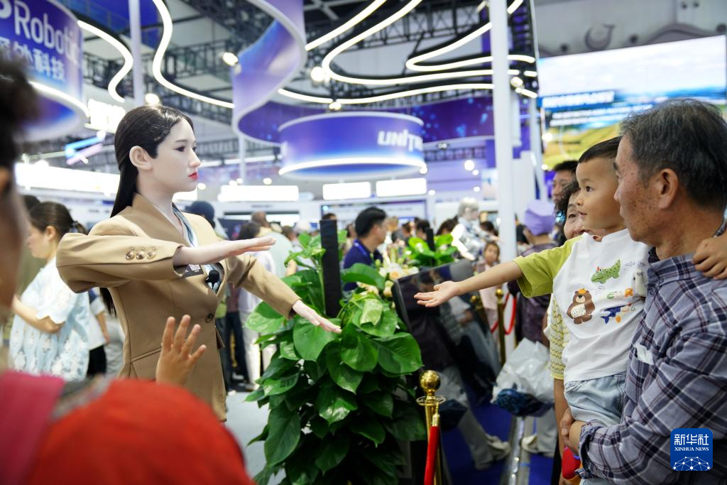 8月29日,觀眾在博覽會現場與一款智能機器人互動。新華社記者 趙宇思 攝