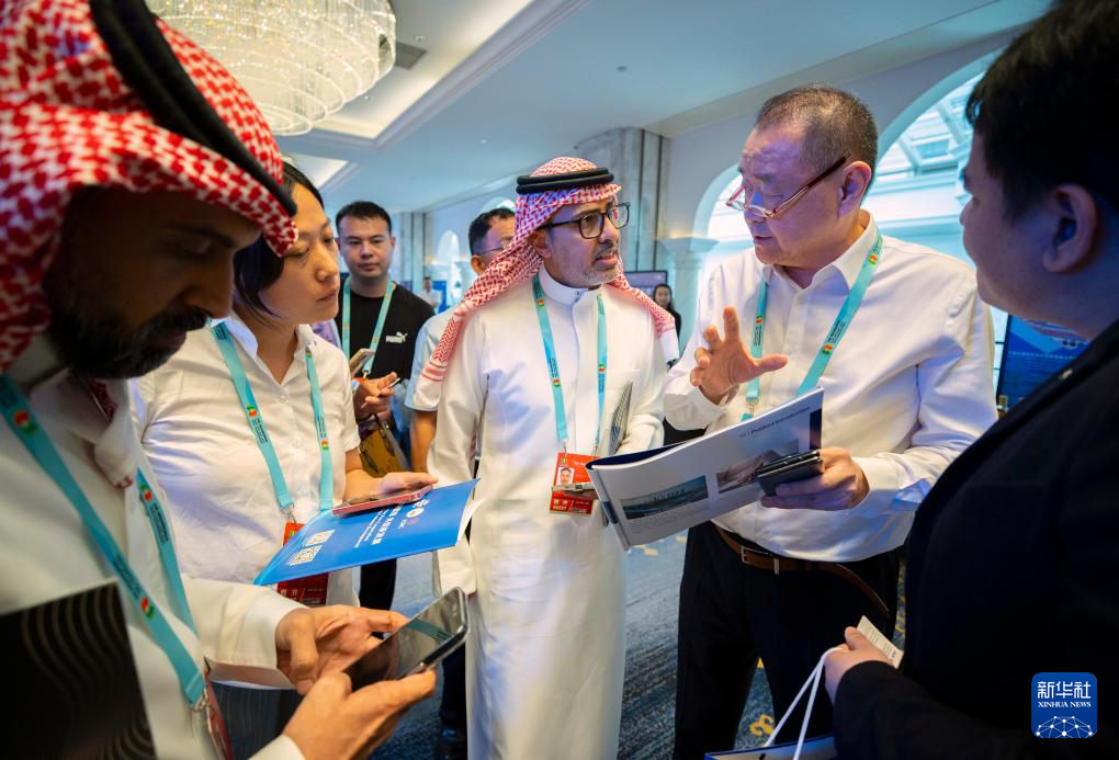 8月28日,在中國—阿拉伯國家經貿投資企業對接會上,參會嘉賓(右三)與企業人員在會議間隙進行商務洽談。新華社記者 楊植森 攝