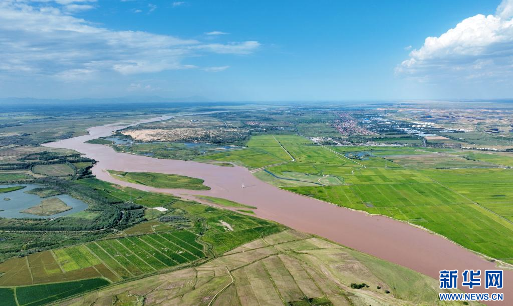 在黃河銀川段,兩岸農田與蜿蜒黃河、道路及橋梁互相映襯,構成一幅“塞上江南”生態美景。