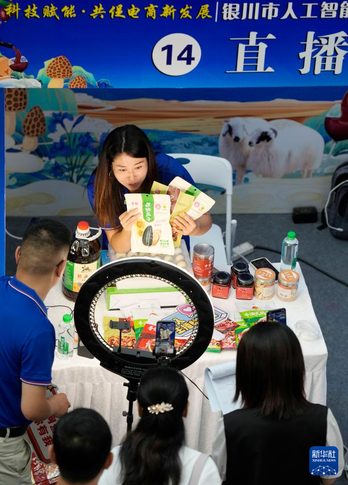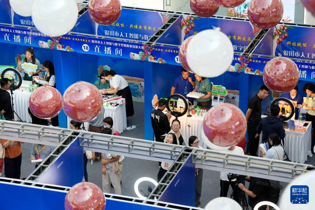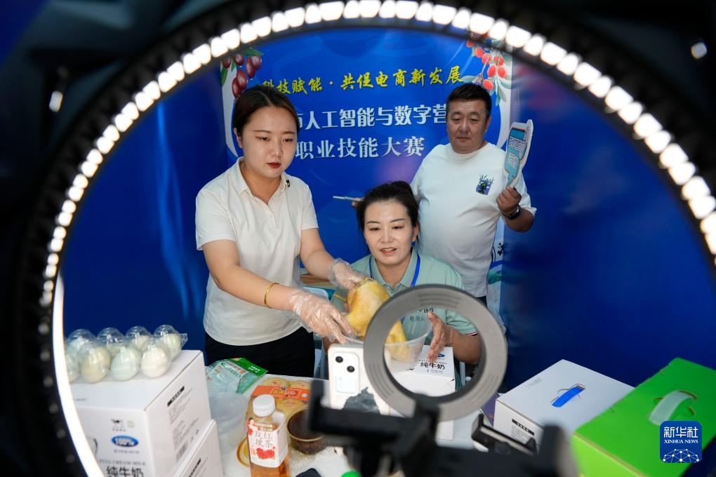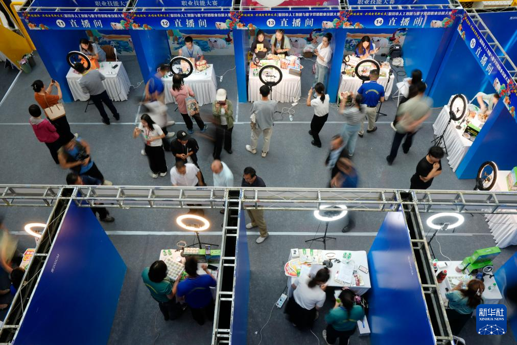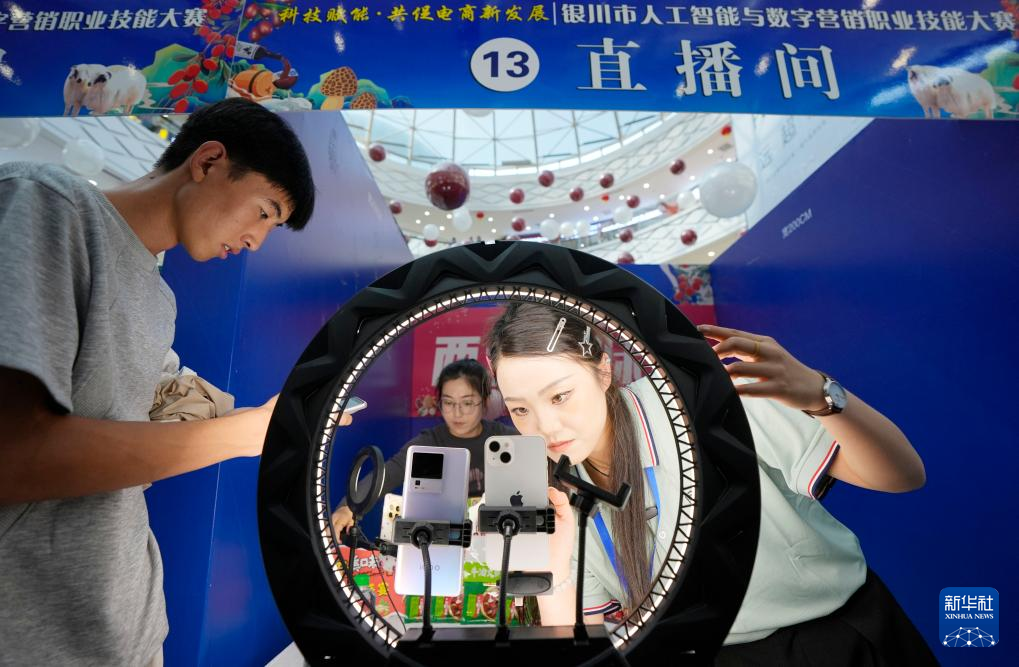 9月12日,寧夏銀川市人工智能與數字營銷職業技能大賽在銀川市金鳳區舉行。60名通過初賽的選手同場競技,現場打造“綠色農產品直播間”“數字人直播間”“退役軍人直播間”“觀眾體驗直播間”等互動區域。通過這次大賽,銀川市將進一步整合行業資源,促進直播電商與本地產業深度融合,激發電商直播領域的創新活力。新華社記者 王鵬 攝