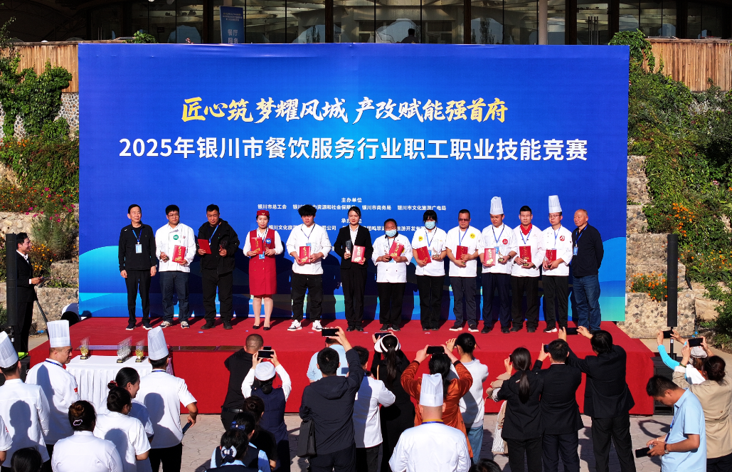 9月23日,2025年銀川市餐飲行業職工職業技能競賽在鳴翠湖國家濕地公園落幕。來自全市餐飲行業的60余名選手齊聚一堂,在中式烹調、中式面點、餐廳服務、羊肉烘烤四個賽項中展開激烈比拼。