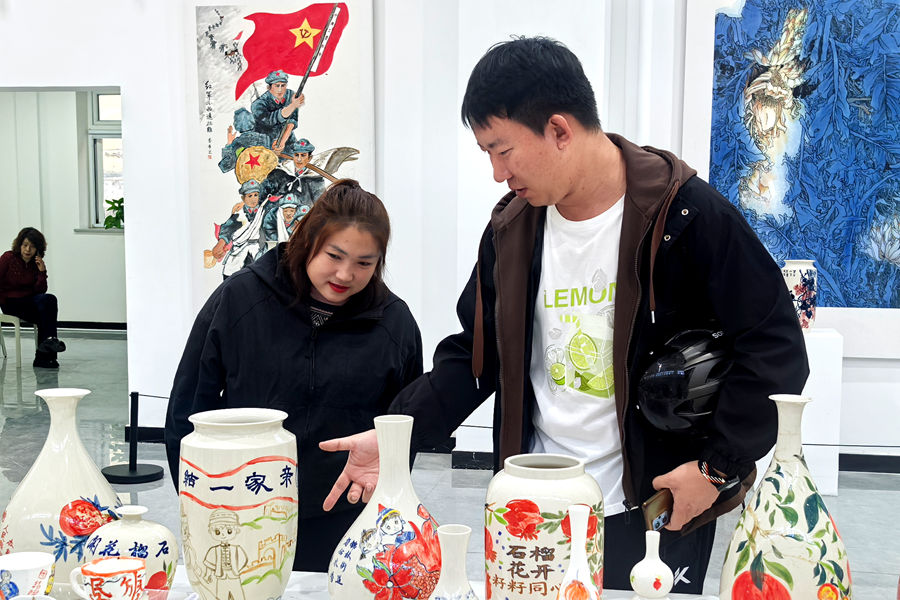 本次展出的陶瓷及其他藝術形式的作品,既有專業藝術家的精湛之作,也有來自基層的質樸表達。大武口區溝口街道、石炭井街道的作品緊扣“三線建設”的時代記憶;大武口區星海鎮的作品則展現了特色農業產業帶動共同富裕的實踐。這些源自生活、扎根泥土的創作,使民族團結的理念更加可知可感。此外,展覽現場還特設了陶瓷制作體驗區,吸引了眾多參觀者。