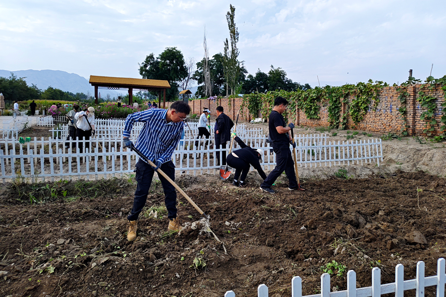 在大武口區錦林街道安康社區共享農場的田埂上,平日里的“筆桿子”們此刻化身“新農人”:有的蹲在玉米地間,熟練地掰下飽滿的果穗;有的手持鐮刀,小心翼翼地為西紅柿、辣椒藤蔓拉秧清茬;還有的兩人一組,踩著鐵鍬深翻土地,鐵鍬碰撞土塊的清脆聲響與此起彼伏的歡笑聲交織成獨特的“田間交響曲”。
