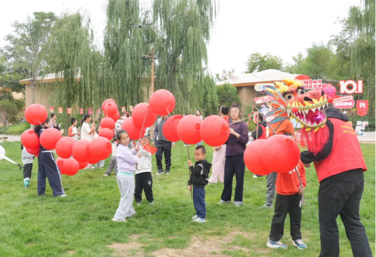 與此同時,賀蘭山腳下的蘭一生態園圍繞親子互動與創意體驗,推出系列特色活動?!白鎳胶悠闯鰜怼弊匀黄磮D挑戰賽在蘭多多親自然樂園舉行,孩子們在家長陪伴下拼出完整的中國地圖,齊聲合唱《我和我的祖國》,并放飛承載祝福的空飄氣球?!懊韧拊旒t龍?燈籠趣游園”活動也吸引了眾多家庭參與,親子共同制作燈籠并串聯成“國慶紅龍”,提燈游園,展現出一幅家國同樂的溫馨畫面。