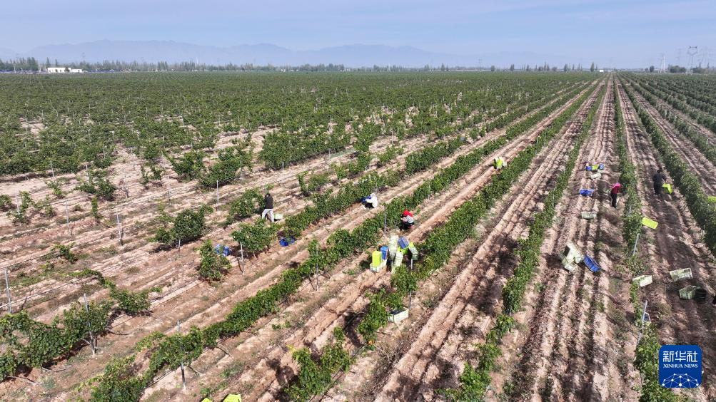 農戶在銀川市永寧縣閩寧鎮葡萄地里采摘釀酒葡萄(無人機照片,10月14日攝)。新華社記者 楊植森 攝